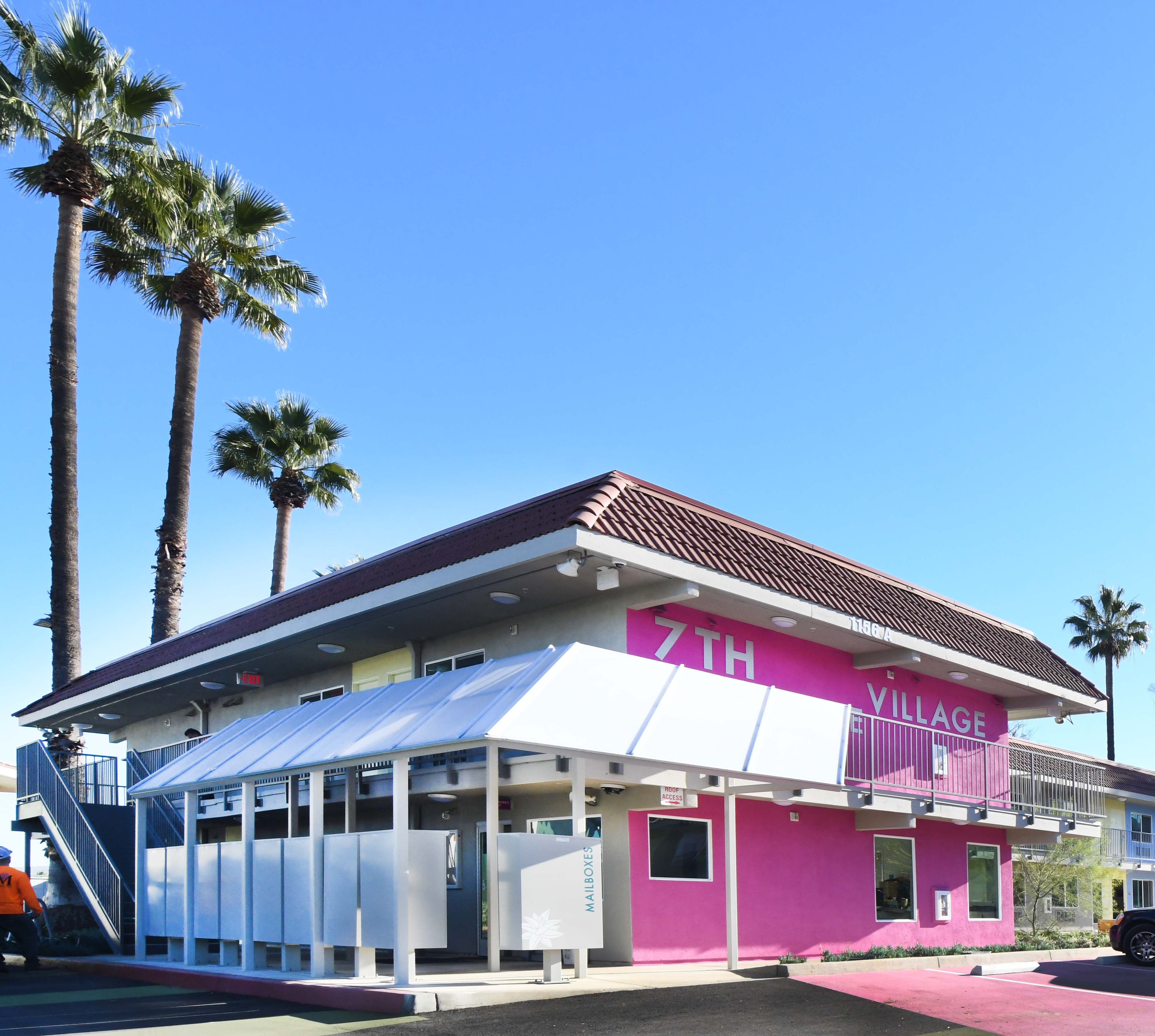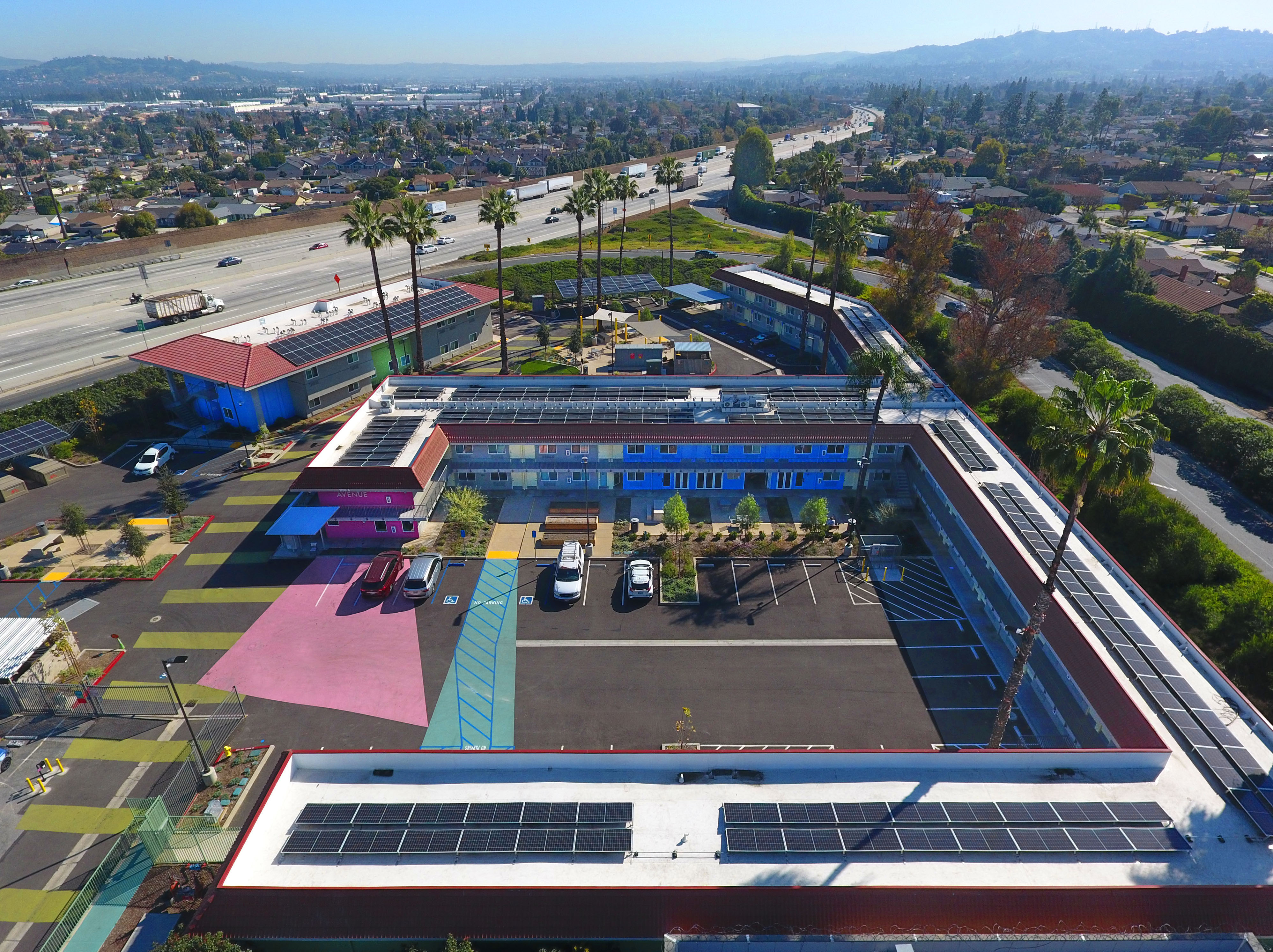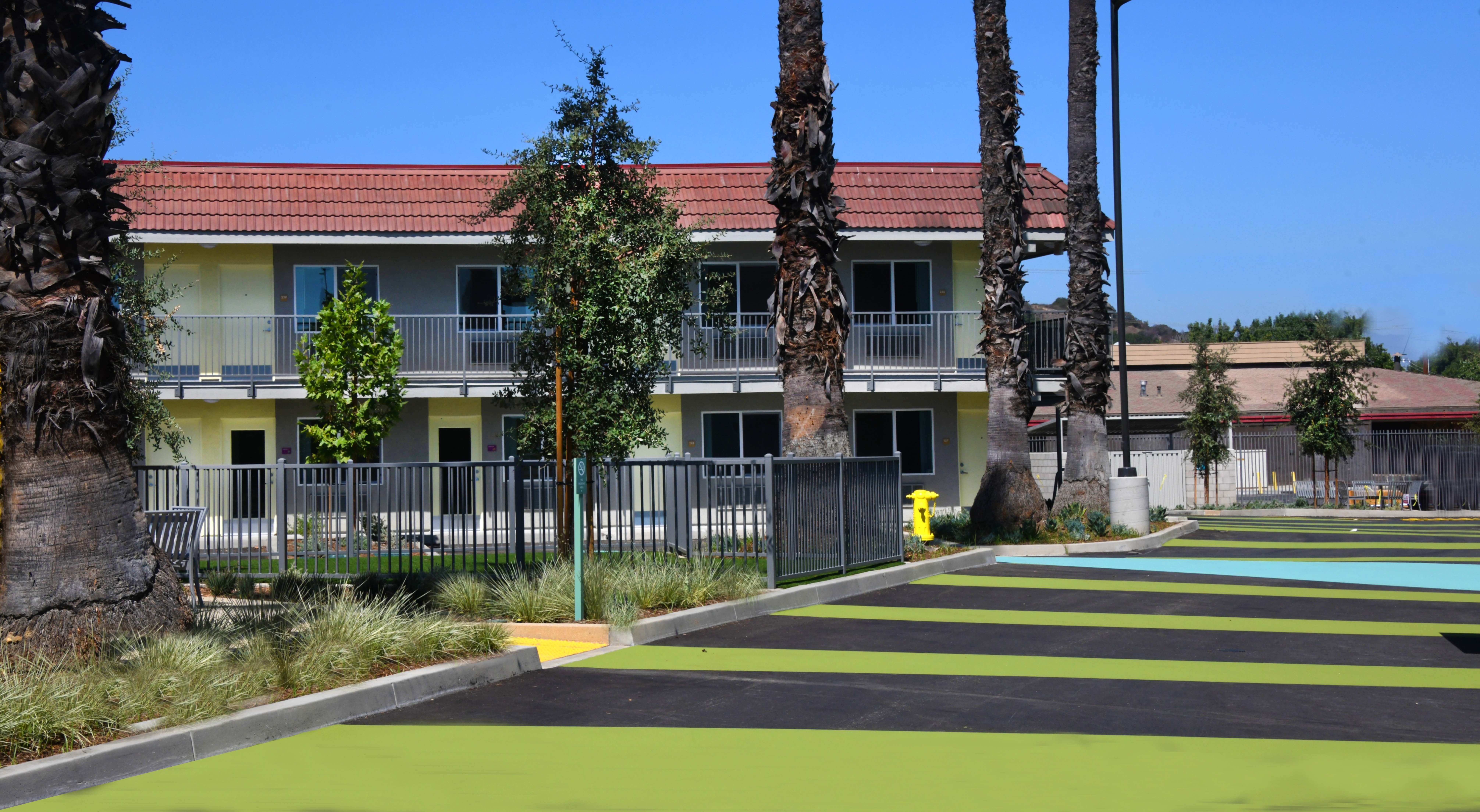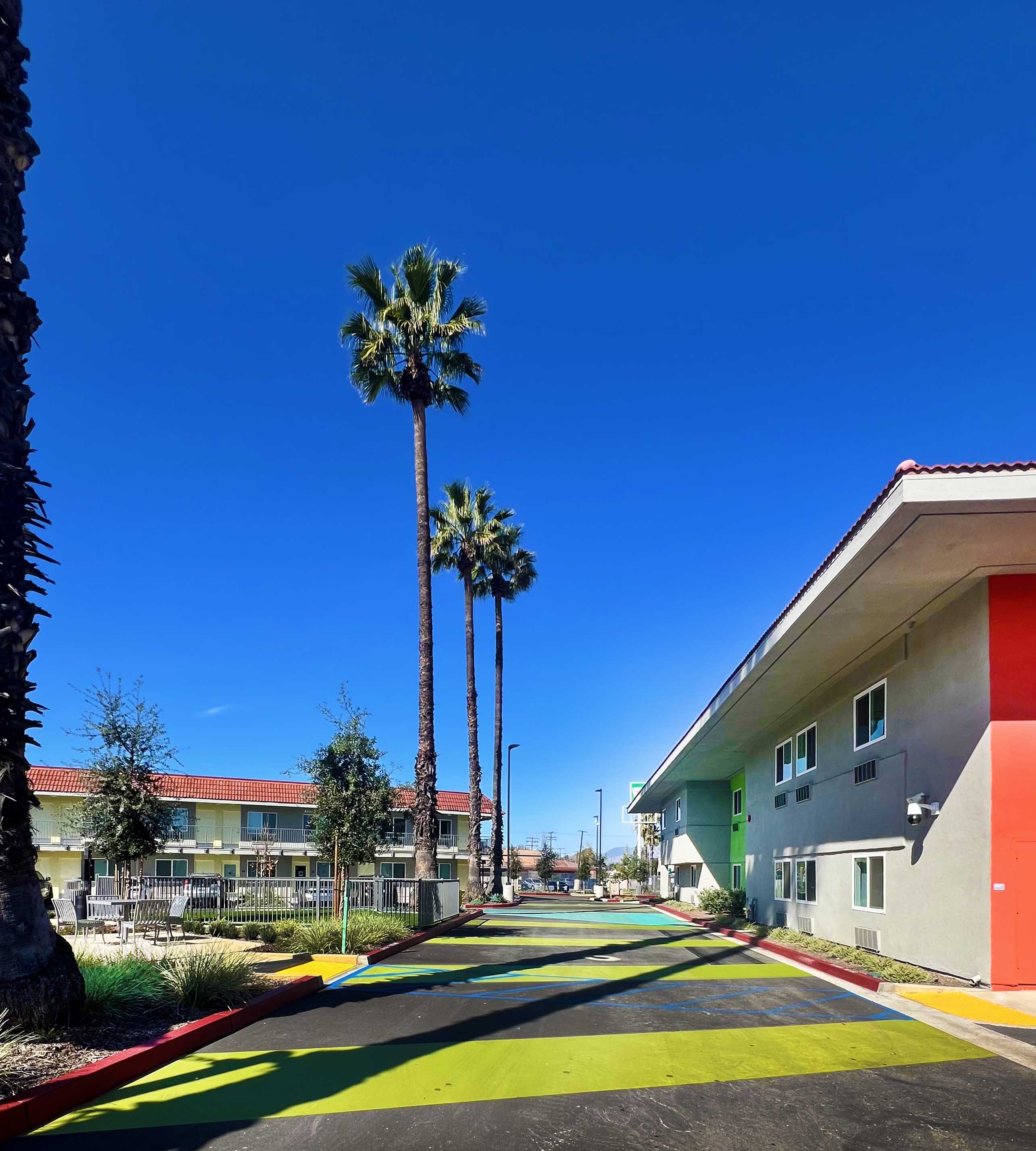 One of the first motels acquired by Los Angeles County through Project Homekey, a former freeway-side Motel 6, is being reimagined as 7th Avenue Village in Hacienda Heights—a long-term supportive housing community for formerly unhoused individuals. The 2.5-acre site is now a 144-unit campus, transforming an asphalt lot into a livable neighborhood. Compact residences (200–475 SF) are purposefully designed with full kitchens, renovated bathrooms, and built-in desks to support daily life. The grounds replace paving with green courtyards, shaded parking, and shared amenities—including gardens, outdoor fitness, a dog run, and a community room. Striking colors, layered landscapes, and intentional placemaking create clarity, energy, and a strong sense of arrival. Operated by WORKS, the project exemplifies how design and dignity can redefine housing, integrating sustainability and joy into a model for community resilience.