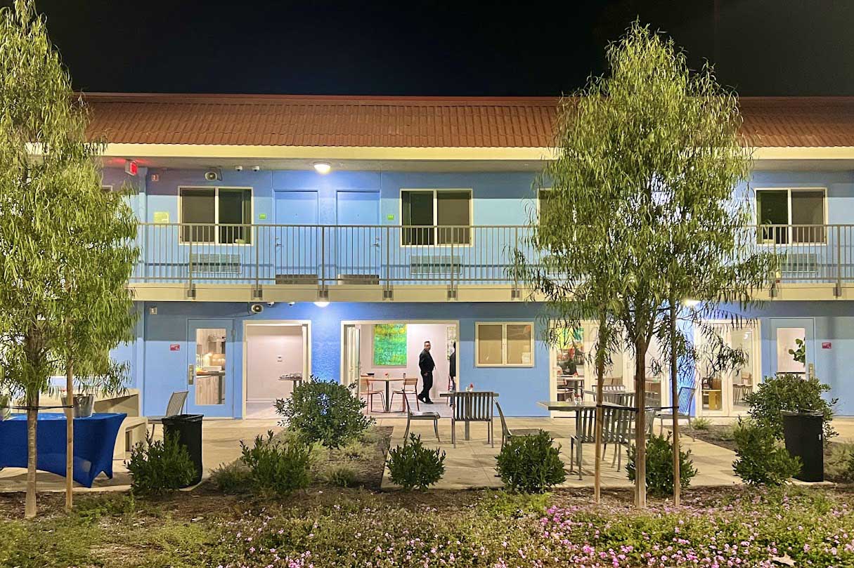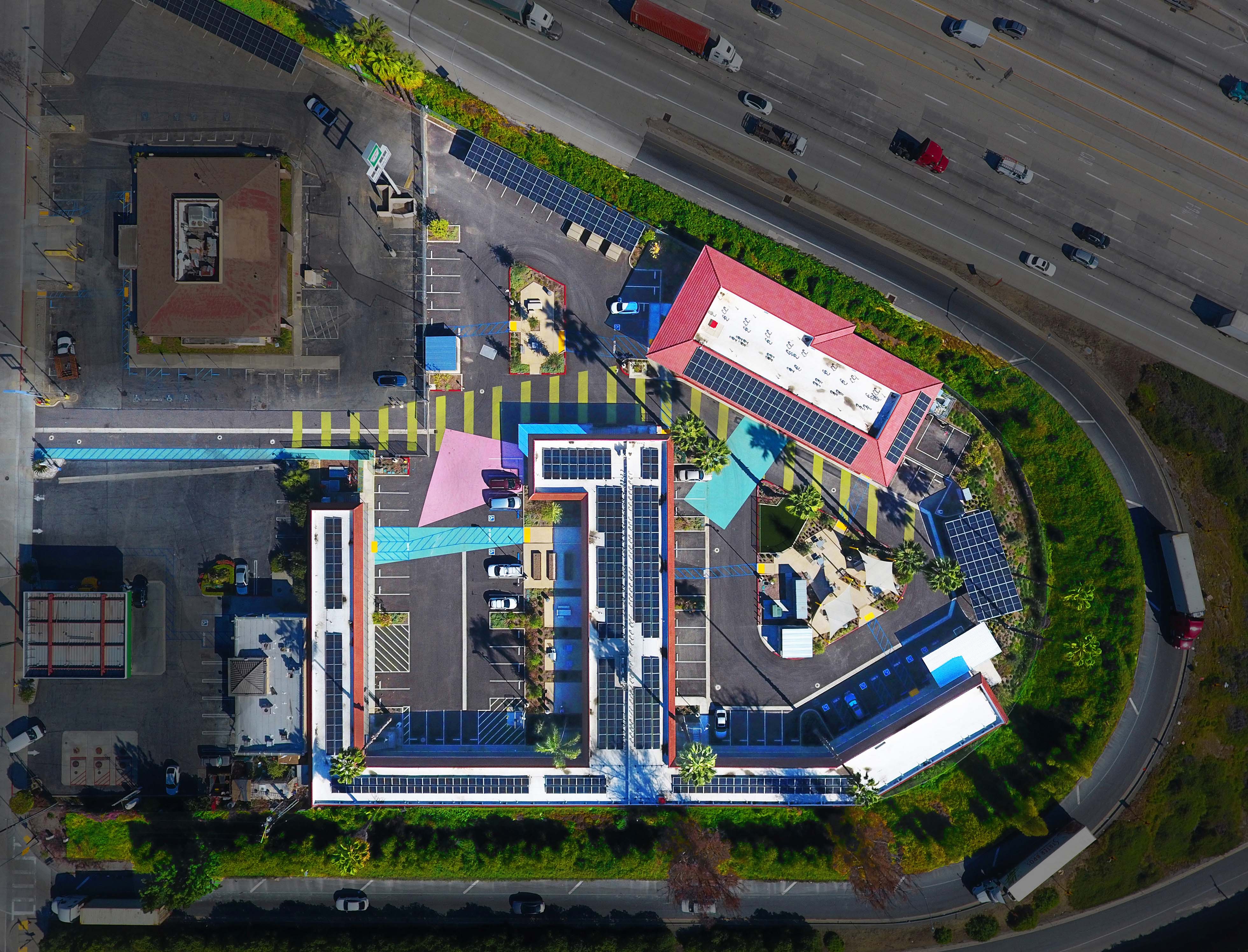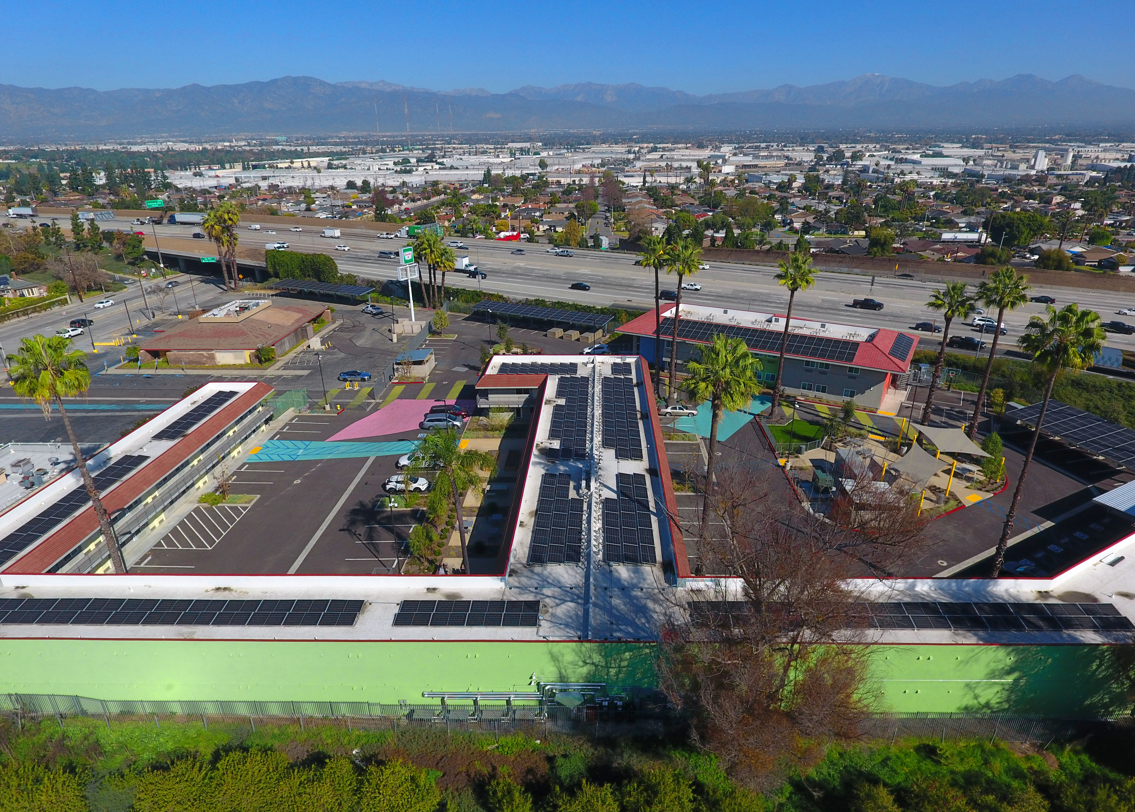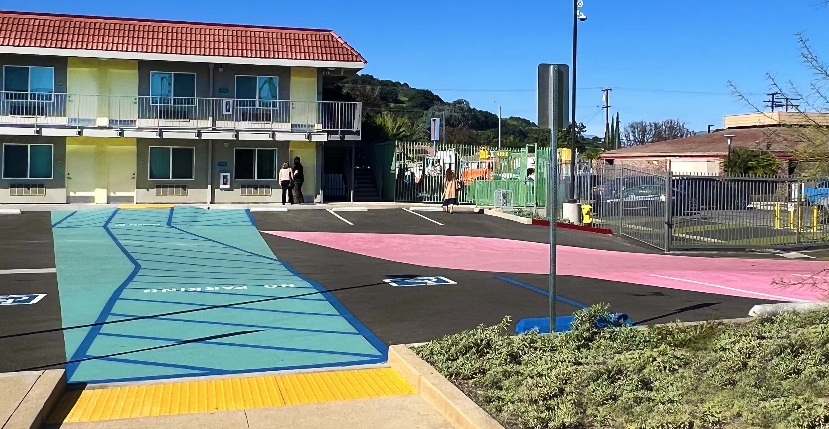 One of the first motels acquired by Los Angeles County through Project Homekey, a former freeway-side Motel 6, is being reimagined as 7th Avenue Village in Hacienda Heights—a long-term supportive housing community for formerly unhoused individuals. The 2.5-acre site is now a 144-unit campus, transforming an asphalt lot into a livable neighborhood. Compact residences (200–475 SF) are purposefully designed with full kitchens, renovated bathrooms, and built-in desks to support daily life. The grounds replace paving with green courtyards, shaded parking, and shared amenities—including gardens, outdoor fitness, a dog run, and a community room. Striking colors, layered landscapes, and intentional placemaking create clarity, energy, and a strong sense of arrival. Operated by WORKS, the project exemplifies how design and dignity can redefine housing, integrating sustainability and joy into a model for community resilience.
